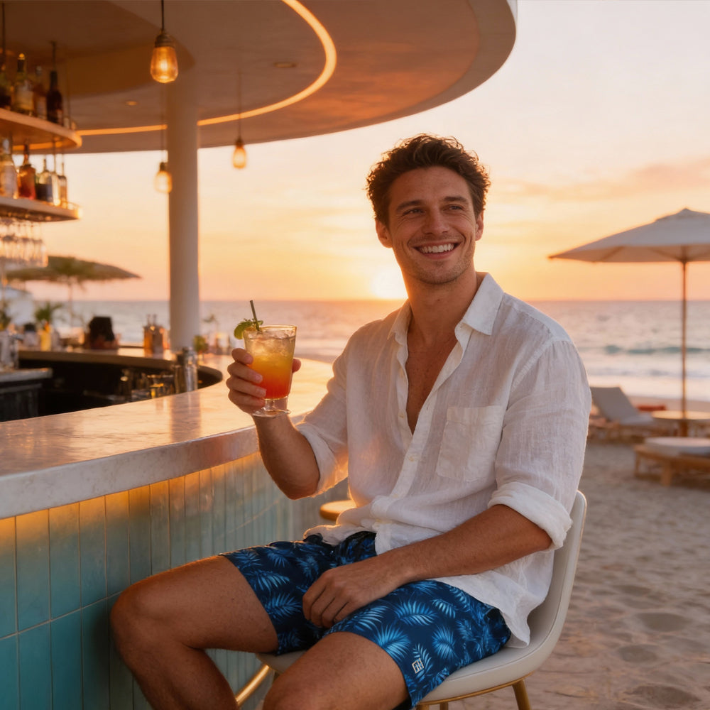 Tailored look that doesn’t scream “swimwear.” Clean enough for lunch, drinks, or beach side relaxing.